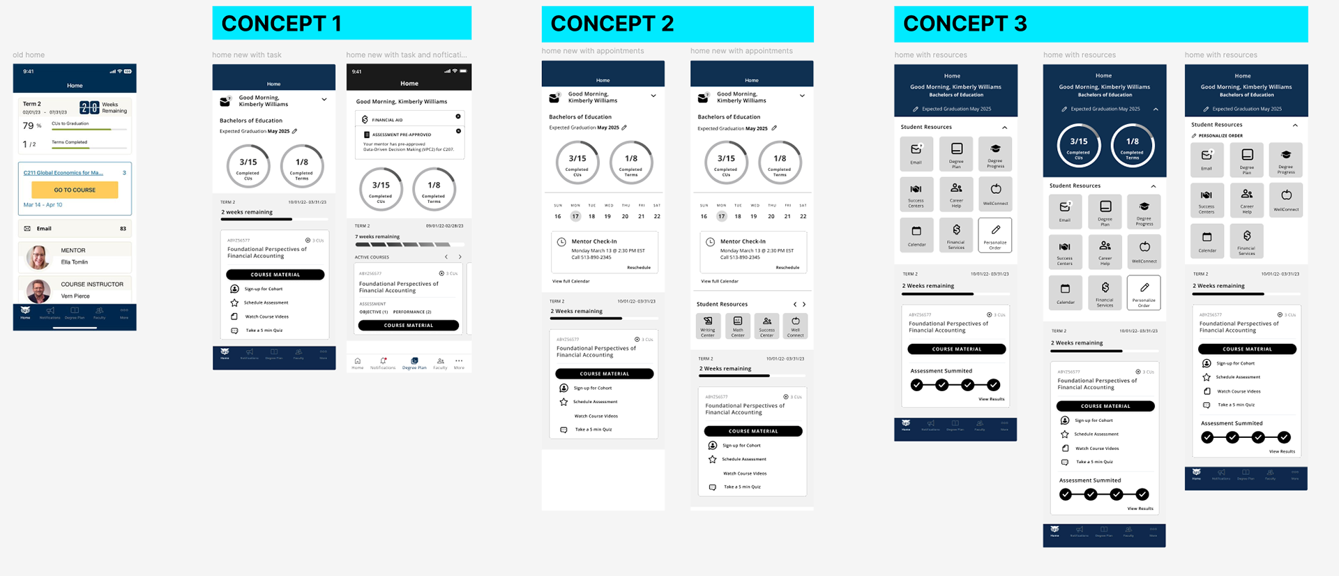 Wireframes were developed after reviewing analytics, heatmaps, and conducting surveys with students. Three different concepts were developed: 1. Focus on progress and coursework; 2. Focus on upcoming events/appointments; and 3. Give a variety of actions for the student to choose from. These concepts were then reviewed by stakeholders and tested with students to see which one would help with progress, and Concept 1, which focused on progress, was what moved forward.